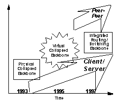 BaySIS will move users gracefully from current physical collapsed backbones to virtual collapsed backbones and ultimately to integrated routing/switching backbones Ñ while protecting cable plant, wire closet, and network centre investments (see Figure 13). One of the most remarkable benefits of the BaySIS strategy is its ongoing reduction of the cost of internetworking. As users move from physical collapsed backbone to virtual collapsed backbone the number of switch ports quickly outnumbers the more expensive routers ports and the per-port cost of the network declines. The return-on-investment potential of the IR/SB is also very good. IR/SB users each have their own dedicated port so the cost is somewhat higher than networks that employ shared media extensively. But the cost-per-megabyte of bandwidth of the IR/SB is very inexpensive by today's standards, due to the phenomenally high amounts of throughput delivered by the hardware-based switching elements. Consequently, the competitive advantages of the IR/SB will ultimately far outstrip those of the conventional virtual LAN switch backbone.