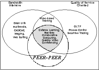 A diversity of common business functions will benefit greatly from direct peer-to-peer interaction of desktop computer users. Just as people now talk frequently on the phone within organisations, in the near future, they will interact computer-to-computer, via full-motion video and simultaneous voice-data connections. For instance, real-time collaborative authoring applications will allow two or more users to work together on documents, diagrams, and multimedia materials while sitting at their own desks. Another emerging cross-departmental application is internal Web servers that will allow users to access central corporate archives and topical multimedia data from their desktop computer. Internal Web servers are part of a growing trend towards "enterprise client/server" applications that cross traditional subnet and departmental boundaries. These and other yet-to-be defined applications will require large amounts of deterministic bandwidth and very specific "customised" network services.