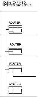To understand the implications of the transition to switched internetworking, it is important to examine the role collapsed backbones play in many networked organisations today. Collapsed backbones evolved from early daisy-chained or "distributed" backbones that originally connected routers on each floor of a building with a single cable (see Figure 3). Linear router backbones were a natural first step towards over-all connectivity, as local networks were built a floor at a time.